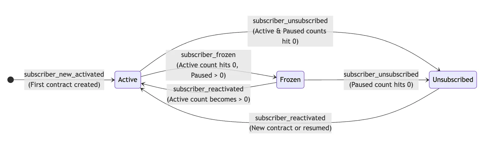 | 102 | 99902 | 2024-02-15 | subscriber_frozen | Moves from active to frozen. |